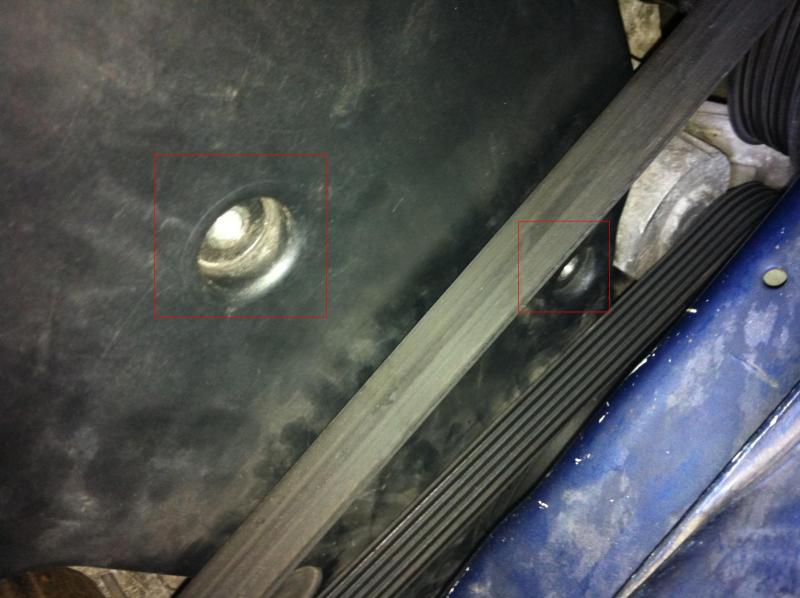 - dévisser les vis qui tiennent le cache, il y'en a trois : 1 en haut, une au milieu, et une en bas au dessus du filtre à huile (Carré Rouge), pour la vis du bas retirer dabord le plastique du par boue qui tien par 3 vis (rectangle jaune)